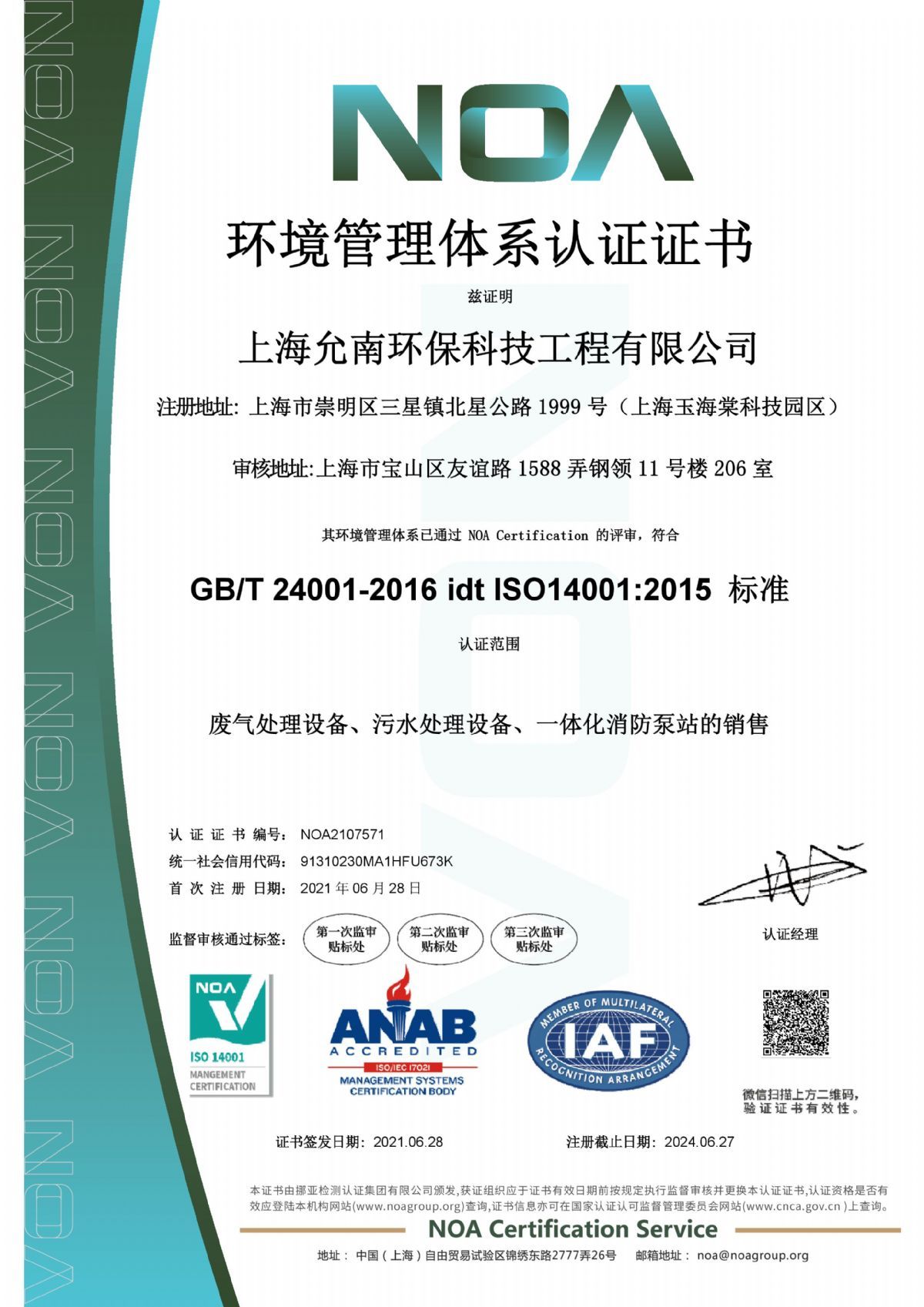 上海允南环保科技工程有限公司-证书中文